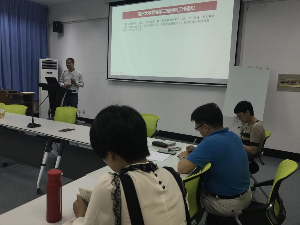 党总支书记周荣就学校党委对电子竞技博彩 党总支的巡察工作进行动员和工作部署。周荣书记向全体教职工传达了温州大学党委第二轮巡察工作通知文件和对接会精神,他要求全体教职工要严肃认真对待巡察工作,统一思想,了解巡察工作内容、目的和工作安排,以“治病防病”、促进电子竞技博彩 健康发展的心态积极配合,希望通过本次巡察工作能发现问题,解决问题,从而促进改革,推动电子竞技博彩 发展。
