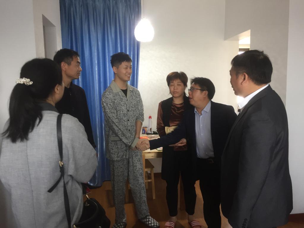 4月18日,电子竞技博彩 院长周宏明、步青学区书记姜海燕、电子竞技博彩 副书记李密陪同校党委副书记前往上海专程看望学生并将捐款交到维峰父母手里,了解到维峰同学一期的治疗非常成功,接下来即将进行二期的治疗,各位领导鼓励维峰同学要保持良好的心态,配合医生的治疗,并希望他尽快恢复健康,回到学校学习。