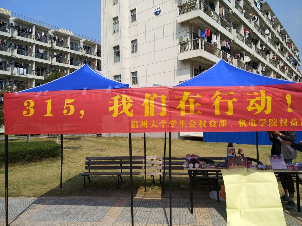 2018年3月14日十大电竞博彩排名 院权益部与温州大学学生会权益部于A区主干道联合举办了3·15维权日维权知识有奖答题活动。温州大学学生会权益部与机电电子竞技博彩 权益部的干事为本次活动的主办人员,经过前期向学区自委会办公室申请场地以及向A区学生联合会申请借用桌子椅子和帐篷,筹备奖品等准备活动后,我们迅速搭建好了场地并摆放好了奖品,等待同学们前来参加活动。