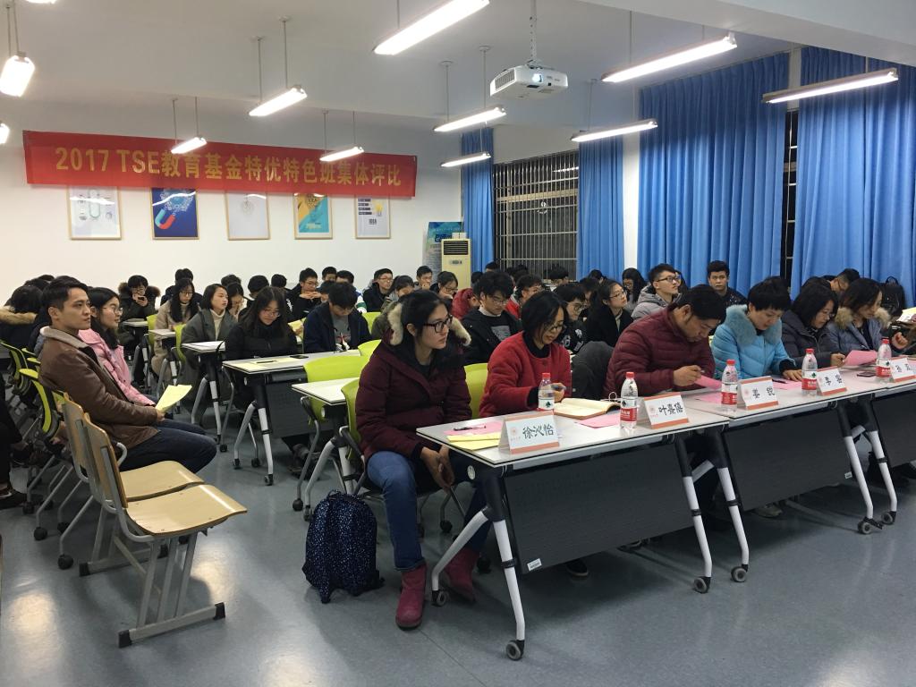 12月19日,电子竞技博彩-十大电竞博彩排名 2017年“TSE”教育基金特优特色班集体评比在电子竞技博彩 B201会议室隆重召开。电子竞技博彩 副院长姜锐,党总支副书记李密,教学科叶熹僖以及学生科孙双、郑妤、徐沁怡等老师担任本次评比大会的教师评委,各年级委员会全体成员、团委学生会主席团、各班级代表担任学生评委。