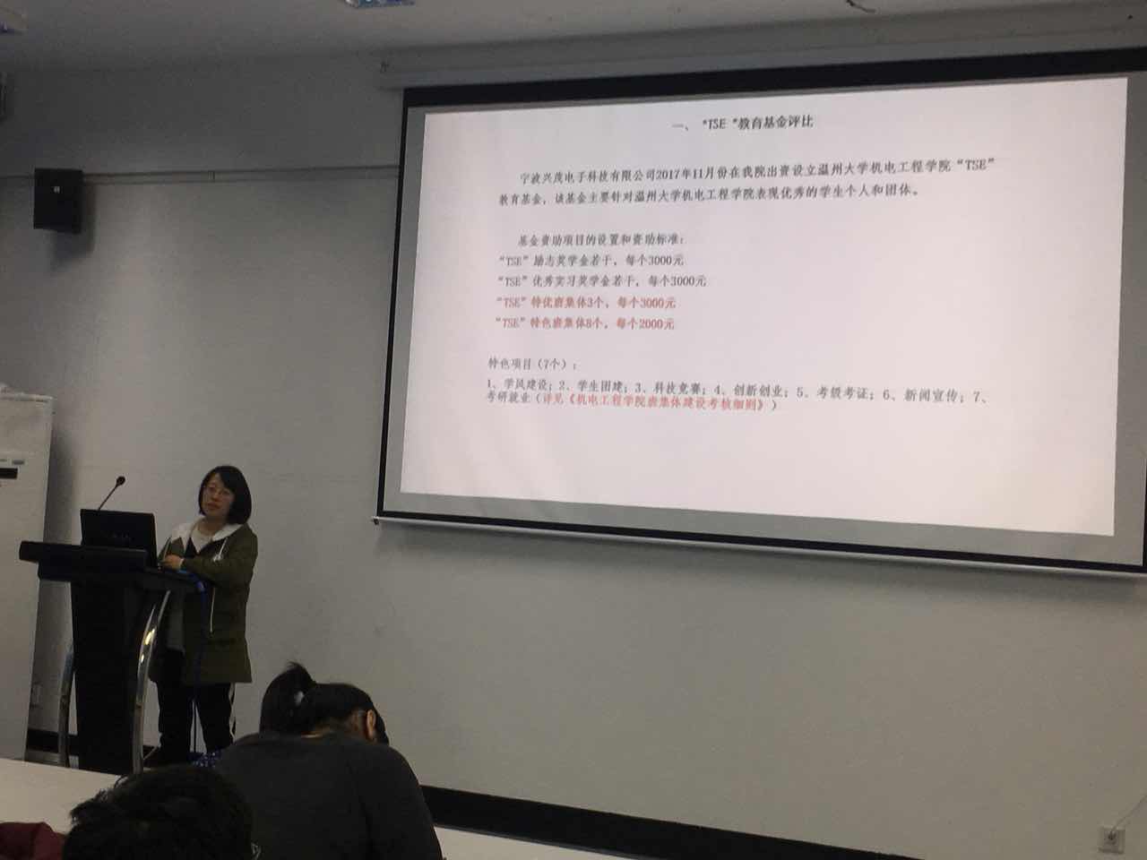 随后发言的是学生科孙双老师。孙双老师的发言总结了上学期各班的考试通过率、科研竞赛成果。她同时就TSE奖学金设置以及评比方法,电子竞技博彩 和班级学习标兵评选、学校优良学风班级立项进行了详细讲解。她在最后对科技之光活动月闭幕式暨年度颁奖典礼做了具体部署。最后发言的是徐沁怡老师。她首先补充了早晚自习请假制度。然后她强调了开学以来电子竞技博彩 学风检查情况。