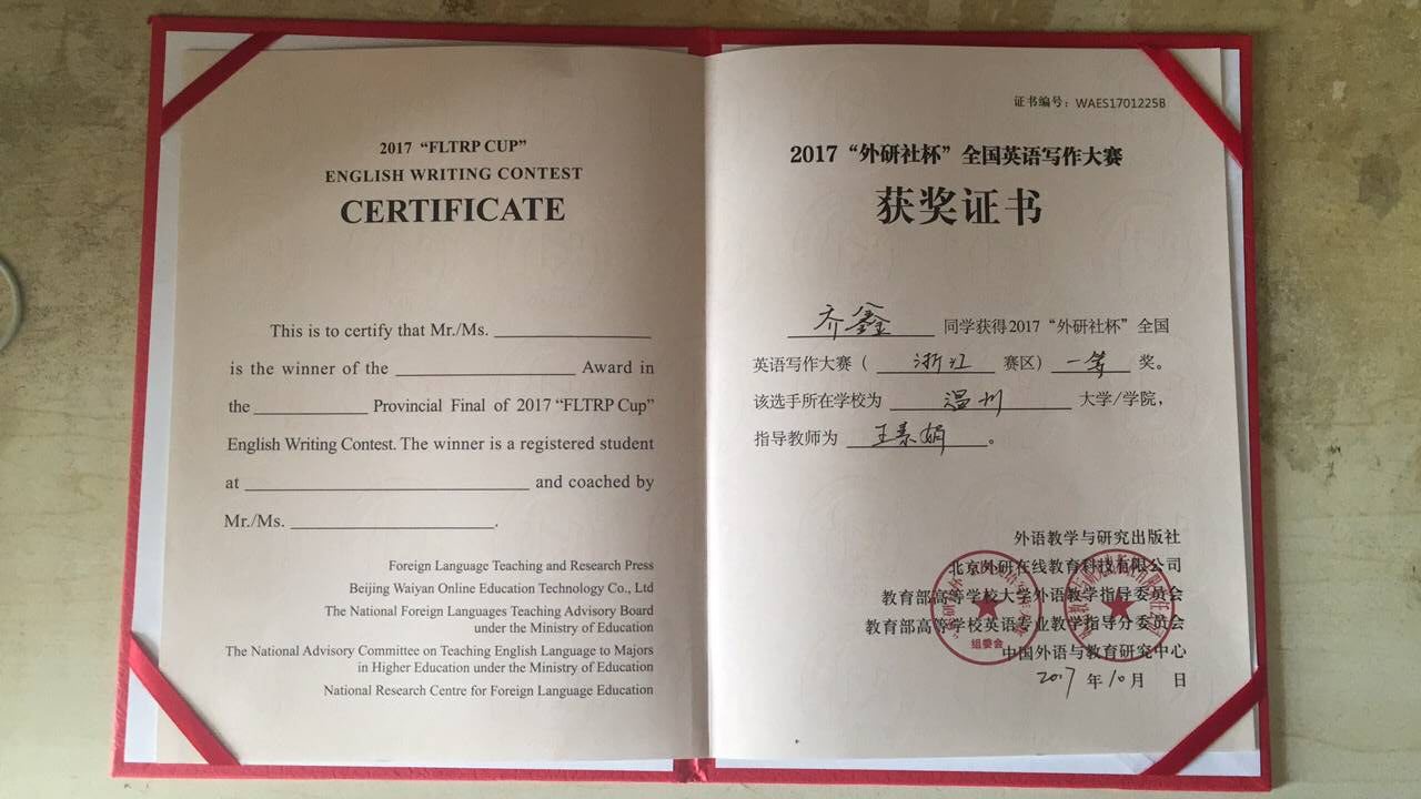 英语是国际指定的官方语言,也是世界上最广泛的第一语言。为助推温州大学“十三五”国际化发展这一重要战略目标的实现,提高英语能力是不可小视的重要组成。作为温州大学第一批国际化专业,电子竞技博彩 的机械工程(国际化)专业在人才培养方面尤其注重学生的外语水平发展,鼓励学生在扎实专业基础的同时,不断提高外语水平,成为真正的国际化人才。2017年10月21日,2017年“外研社杯”全国英语写作和阅读大赛在浙江大学紫金港校区举行。电子竞技博彩 2015级机械工程(国际化)专业的乔鑫获得写作大赛一等奖,是该项大赛中唯一一位非英语专业的获奖选手。此次获奖离不开乔鑫平时的认真努力以及赛前的刻苦训练,也体现了电子竞技博彩 在国际化专业建设中语言能力培养方面的成果。