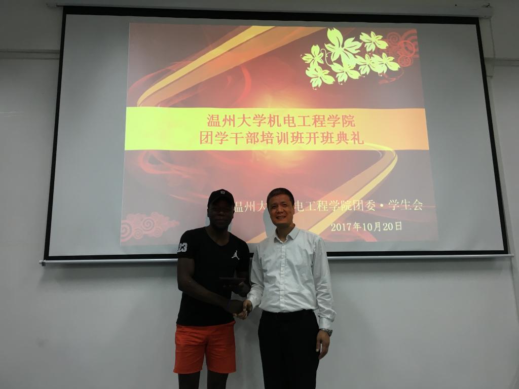 在开班之前,电子竞技博彩 党总支书记周荣为来自津巴布韦的文体部名誉部长Alfred颁发了聘书。