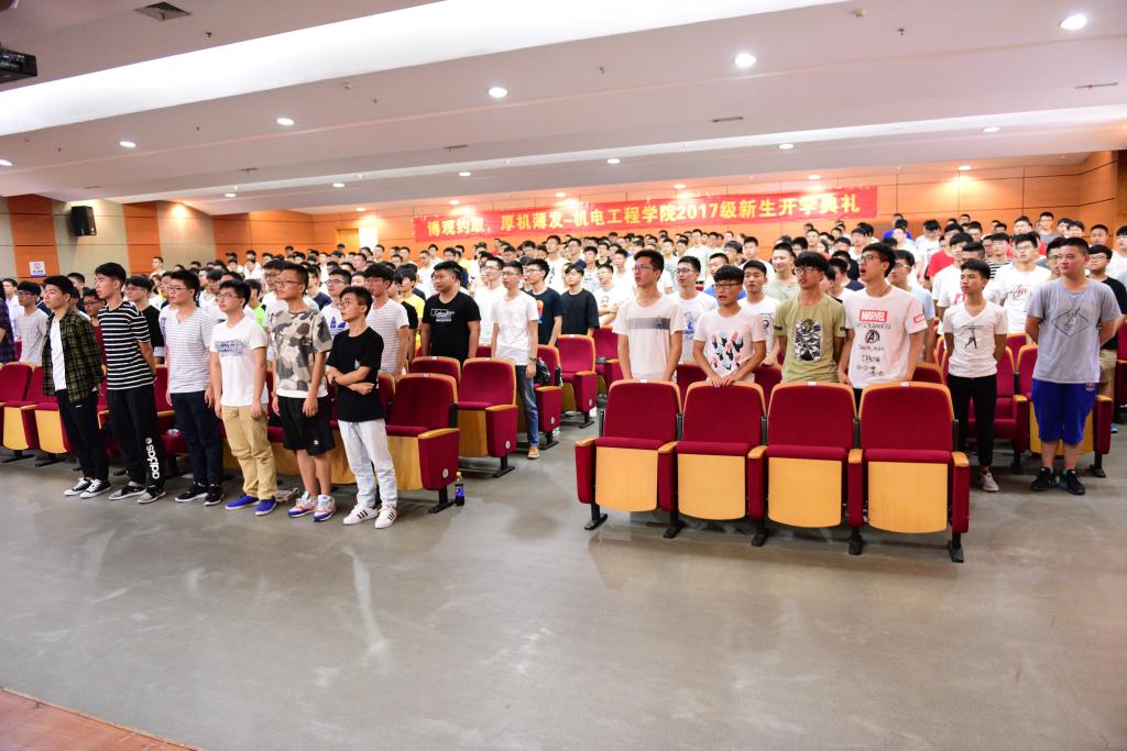典礼在洪亮的国歌声中拉开序幕。首先,周宏明院长发表致辞。周院长对来自22个省的230余名本科新生和来自8个省份的46名研究生新生表示热烈的欢迎。并向新生介绍了电子竞技博彩 三个专业的具体情况、师资力量、实验室设备,并强调电子竞技博彩 非常重视人才培养工作,始终把学生的成长、成才作为电子竞技博彩 的中心任务,通过开展产学合作、学生科技等活动提高学生的综合素质和能力,努力为学生的成长成才提供良好条件。同时,周院长向2017级新生提出了几点期望:本着求学的精神掌握扎实的专业知识,同时也要趁早对自己未来的学习做一个规划;在做人做事方面能宽厚待人,积极进取。最后,周院长向新生们表达了美好的祝愿。
