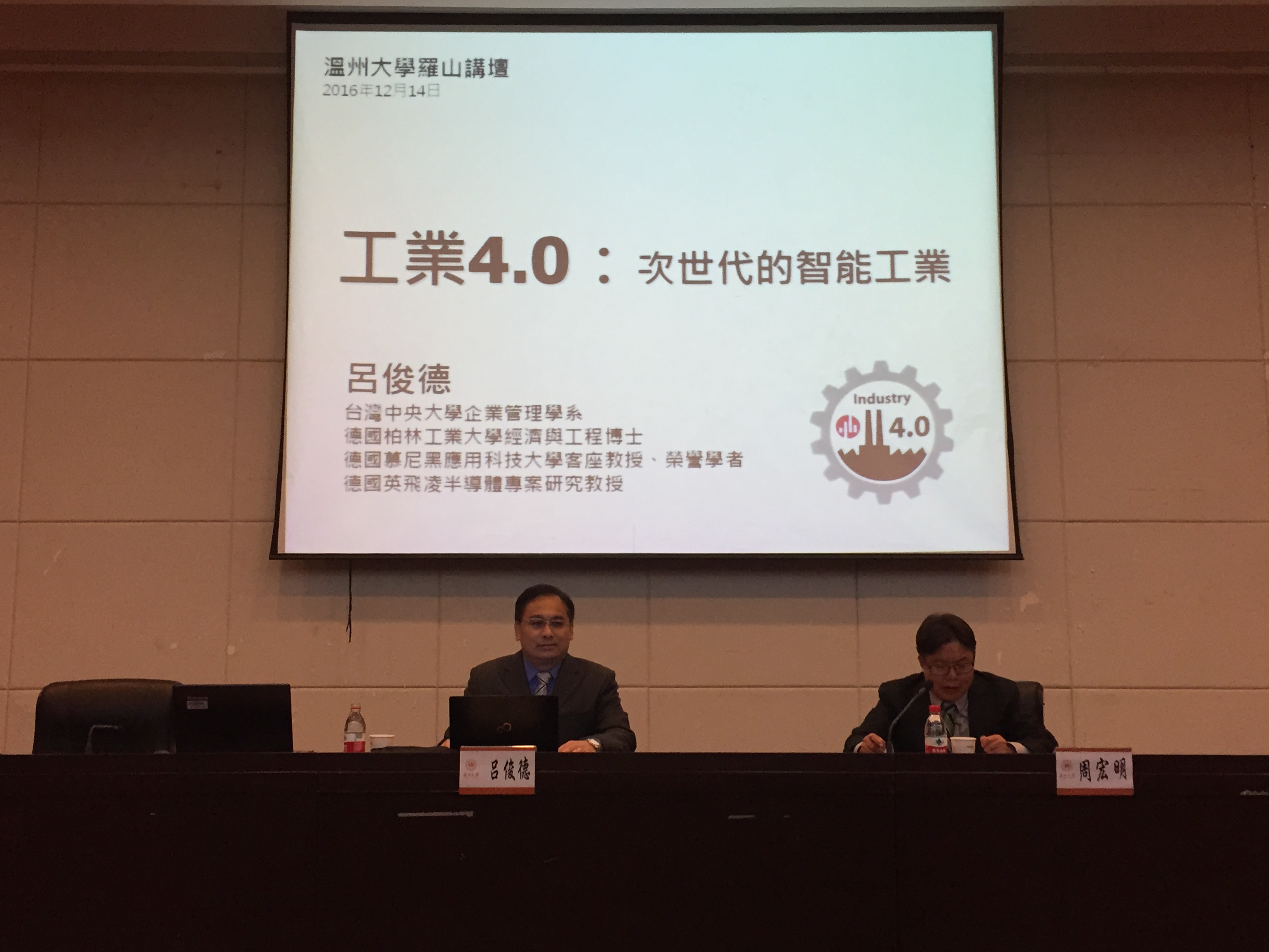 2016年12月14日下午,台湾工业4.0体系研究首席专家、台湾中央大学企业管理学系吕俊德副教授做客温州大学罗山讲堂,为温州大学、温州职业技术电子竞技博彩 的100余名师生作了一场题为《工业4.0:次世代的智能工业》的学术讲座。讲座在温州大学育英图书馆二楼学术报告厅举行,由十大电竞博彩排名 和外事处联合承办,十大电竞博彩排名 院长周宏明主持。