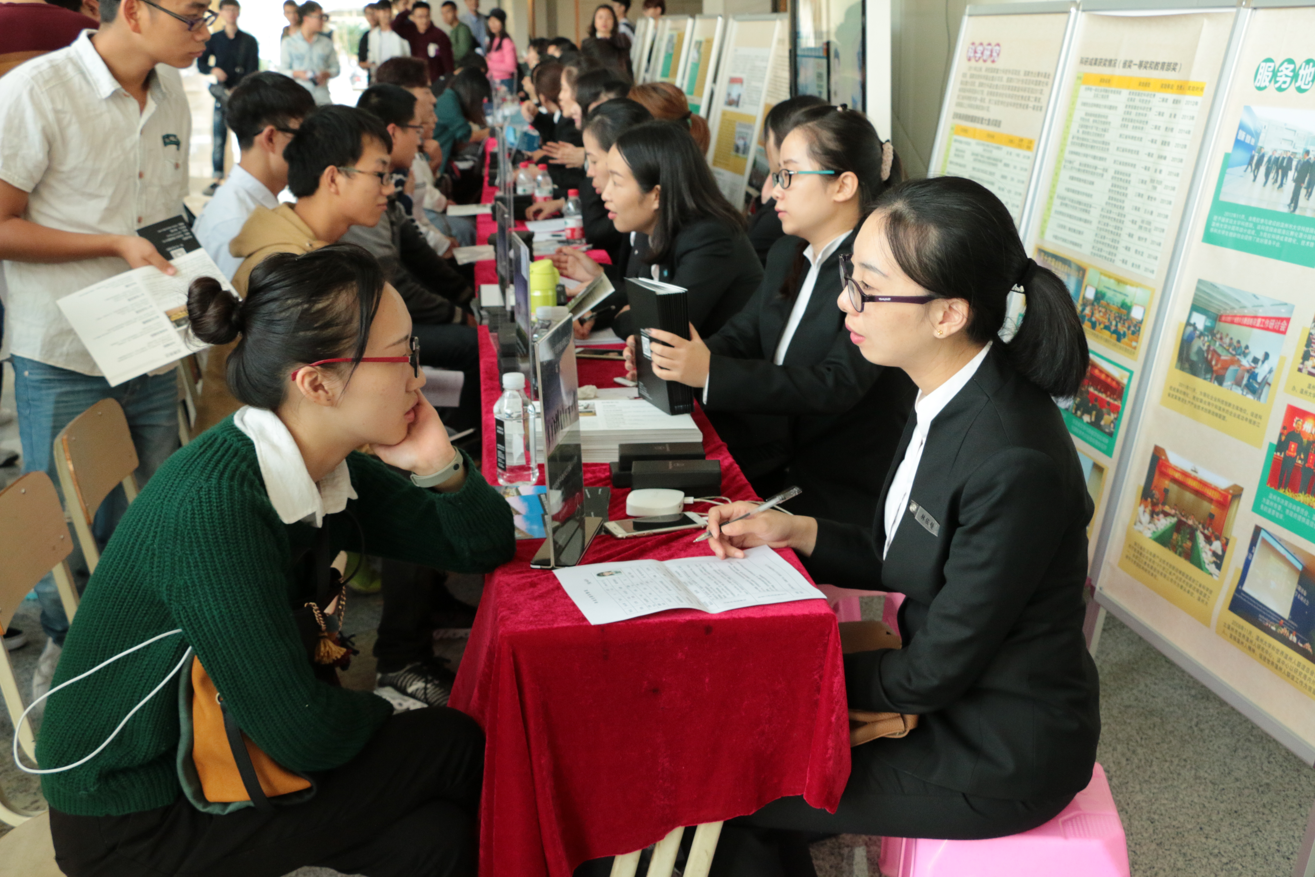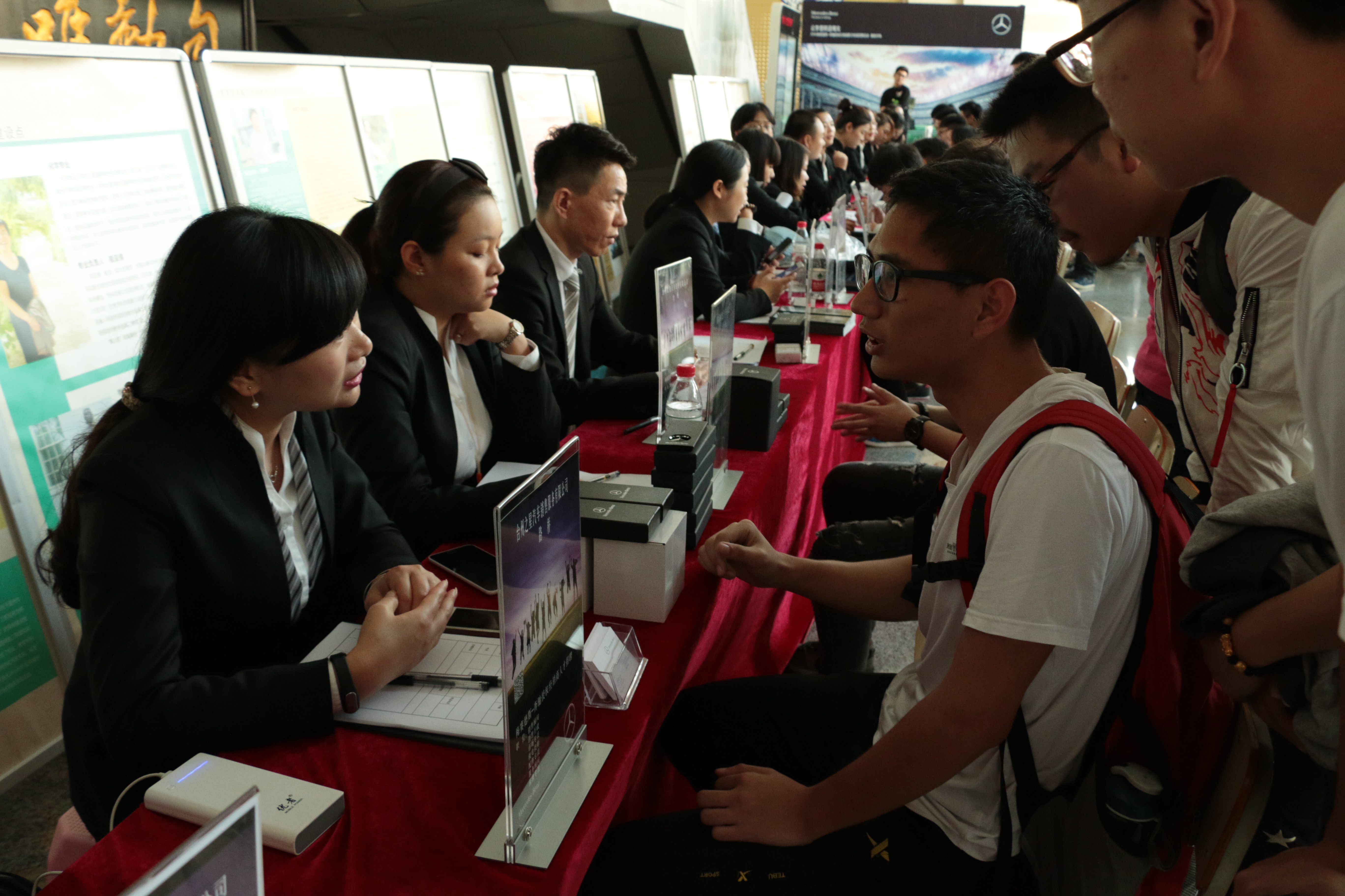 宣讲会之后,梅赛德斯奔驰在会展中心为来自各校各院的准毕业生以及对奔驰公司有意向的同学们开设了20多家门店的招聘点。同学们现场就能向梅赛德斯奔驰投出自己的简历并现场进行面试。