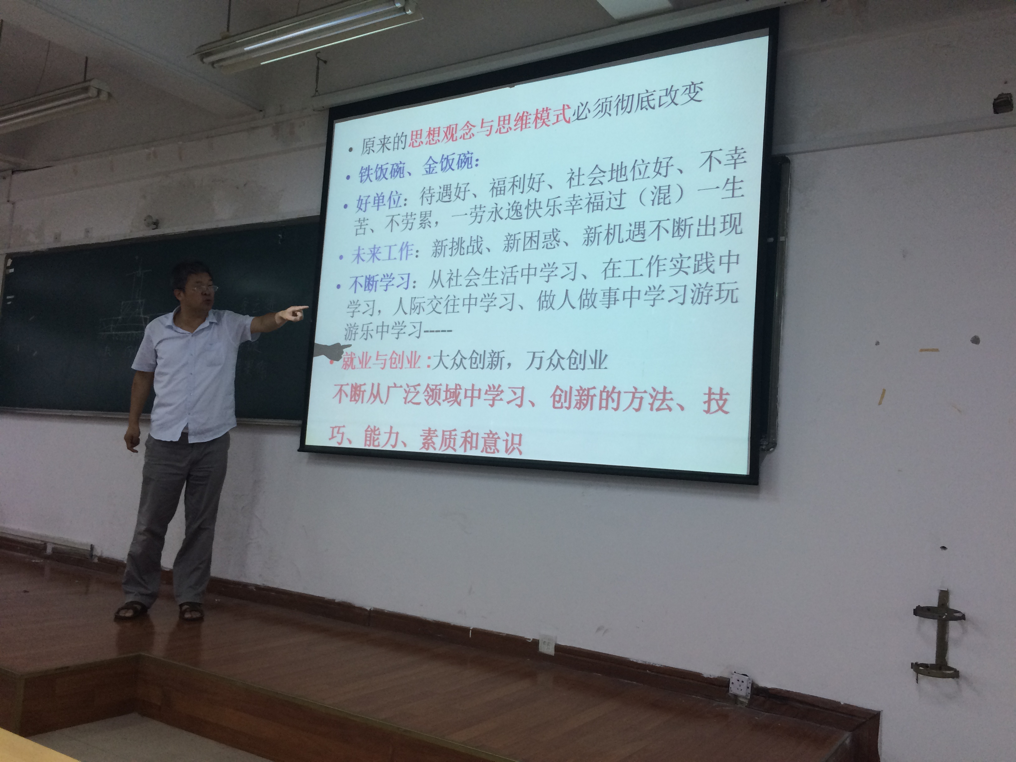 冯教授从“我这一生该如何度过?未来我最理想的状态?”两个问题入手,启发学生对自身的思考,引导学生转变原有的“金饭碗、铁饭碗”等思想观念和思维模式,不断从广泛领域中学习、创新的方法、技巧、能力、素质和意识;就业是个人综合素质的体现,需要不断完善个人,积累经验和技巧。引发每个人对自身的思考,深度发掘学生对自我追求的探索。