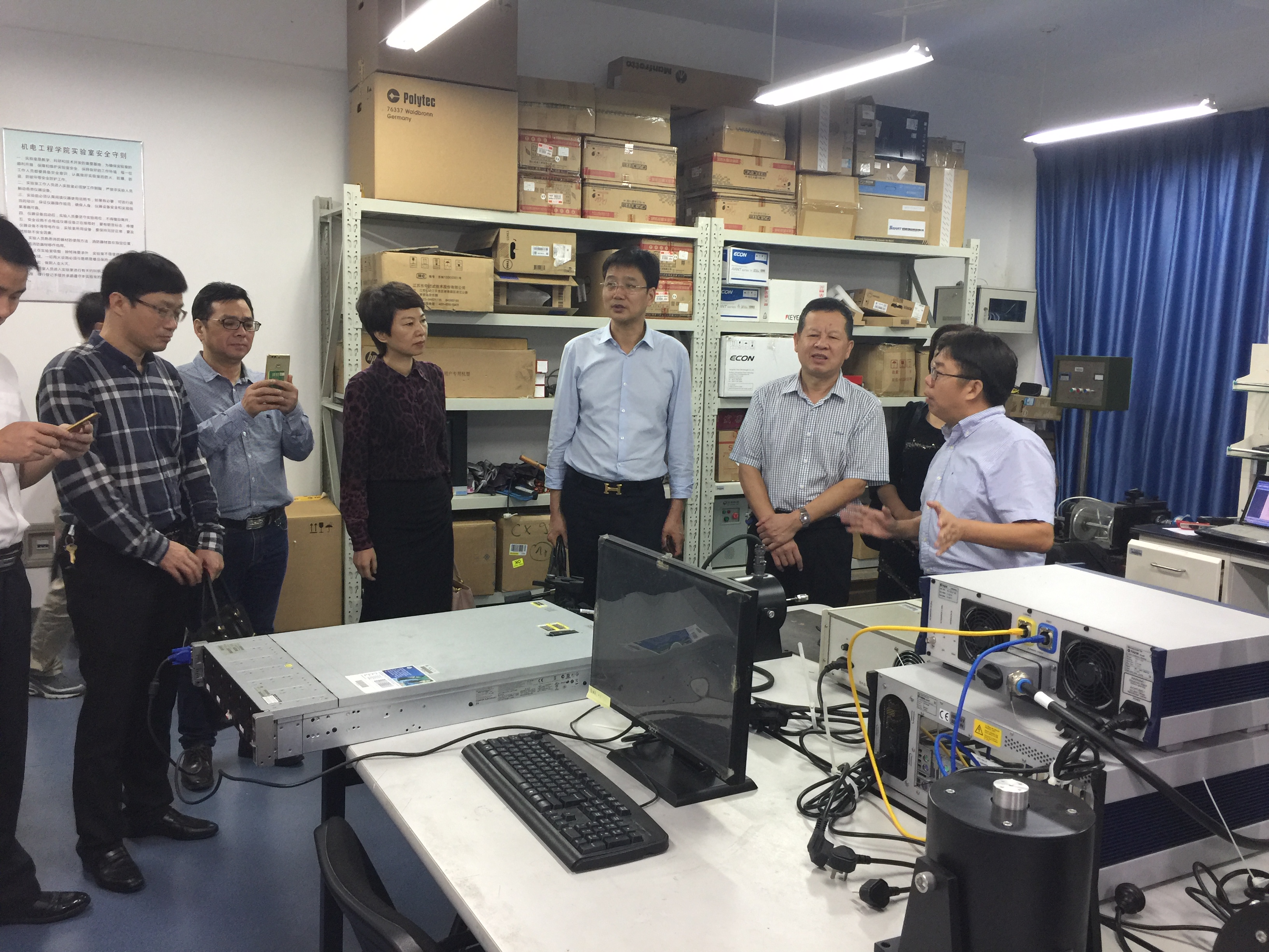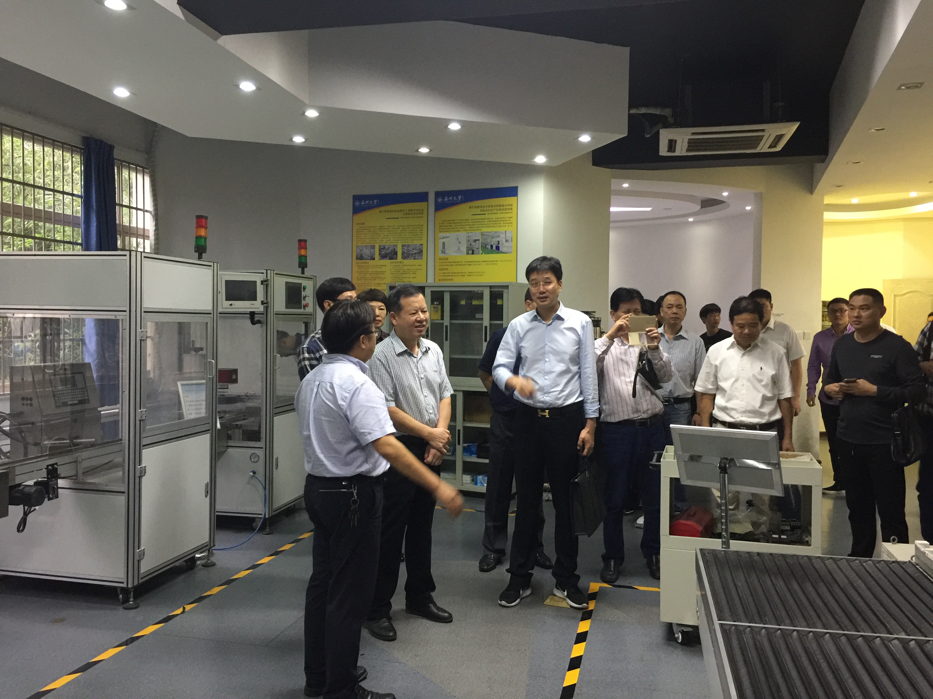 2016年10月18日,瑞安市政协主席白一帆、副市长陈荣臻一行10余人莅临电子竞技博彩 参观访问。电子竞技博彩 院长周宏明教授、实验室主任林礼区陪同参观。