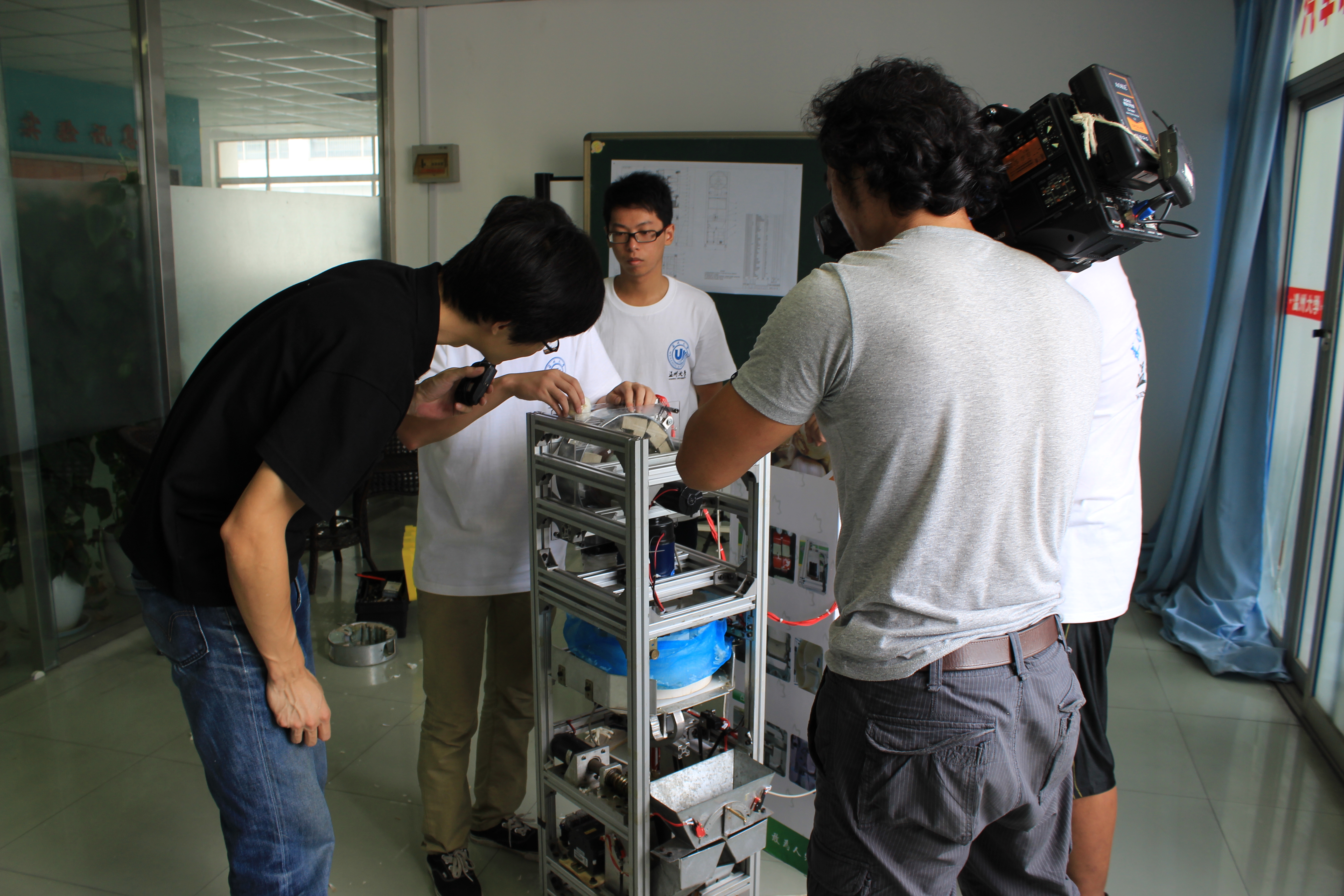 近日,我校十大电竞博彩排名 大学生科技创新作品“多功能自动剥蒜机”创作团队受邀参加中央电视台科教频道《我爱发明》栏目的节目录制, 8月22日至8月29日央视摄制组在我校进行了现场拍摄 。