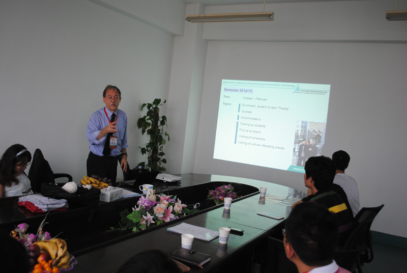 2013年5月19日下午,十大电竞博彩排名 在6C401会议室举行了一场德国耶拿应用技术大学“机械电子学”项目的专场交流座谈会。即将于今年10月赴德参加该项目的同学与来温参加我校80周年校庆活动的德方项目负责人Peter Dittrich教授进行了热烈的交谈。Dittrich教授向同学们介绍了耶拿应用技术大学的地理位置、专业及所学课程的一些基本情况。同学们表现出浓厚的兴趣,纷纷用英语向教授详细询问了当地的风土人情、生活学习等方面的细节问题,对即将进行的海外学习生活充满憧憬,气氛非常热烈。另外,电子竞技博彩 相关负责老师周晨、李勇、钟蓉以及2012年参加过该项目的部分同学也参加了此次会议。