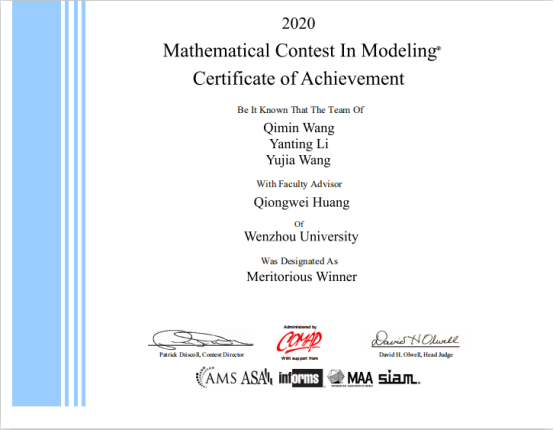 近日,2020年美国大学生数学建模竞赛成绩揭晓。电子竞技博彩-十大电竞博彩排名 18工业工程班的王启敏、李艳婷和汪雨佳三位本科生组成的参赛团队,在激烈的角逐中脱颖而出,荣获一等奖。这也是机电电子竞技博彩 本科生在国际性数学建模大赛中的首次获奖。