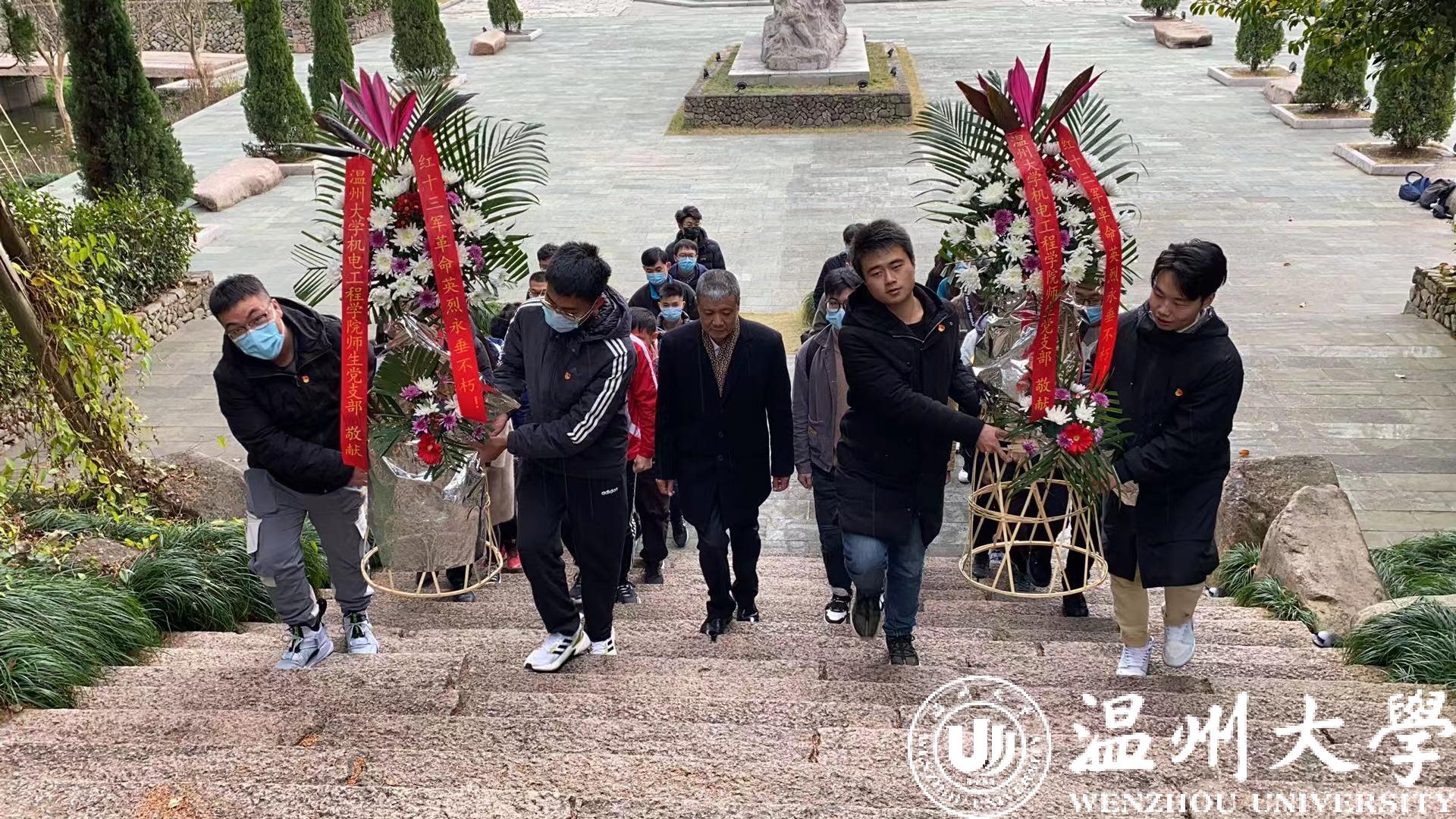 研究生党员和入党积极分子在周荣书记带领下向中国工农红军第十三军纪念碑敬献花篮,随后全体同志向纪念碑三鞠躬,缅怀革命先烈。