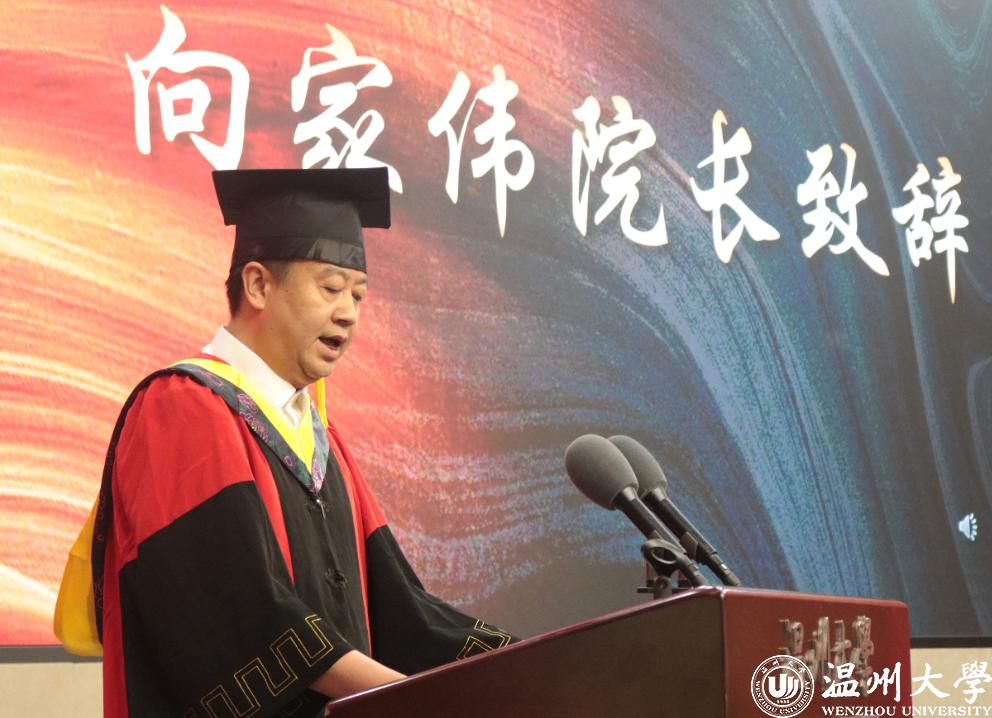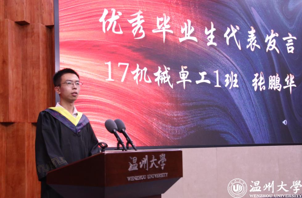 李强老师代表毕业班班主任发表讲话。分别在即,“校园带不走,食堂带不走,图书馆带不走,实验室带不走,老师带不走,同学带不走。”能够带走的是这四年来所积累的学识与抱负。回顾四年的共同奋斗,每个人身上有着无限的可能,在今天,“温州大学,又将被复制成上百个‘小温州大学’,去到世界的各个角落,传播温大的文化和价值!”