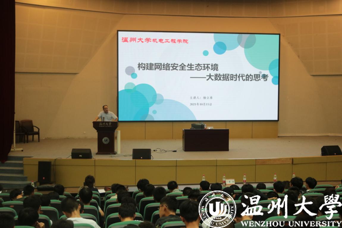 当下正值我校网络安全周,为了增强同学们的网络安全意识,提高运用网络能力,筑牢网络安全防线,电子竞技博彩 特邀请校纪委副书记杨立淮老师于10月15日晚,在教师教育电子竞技博彩 报告厅开展了主题为“构建网络安全生态环境––大数据时代的思考”的讲座。我院21级全体本科生,研究生参加学习。