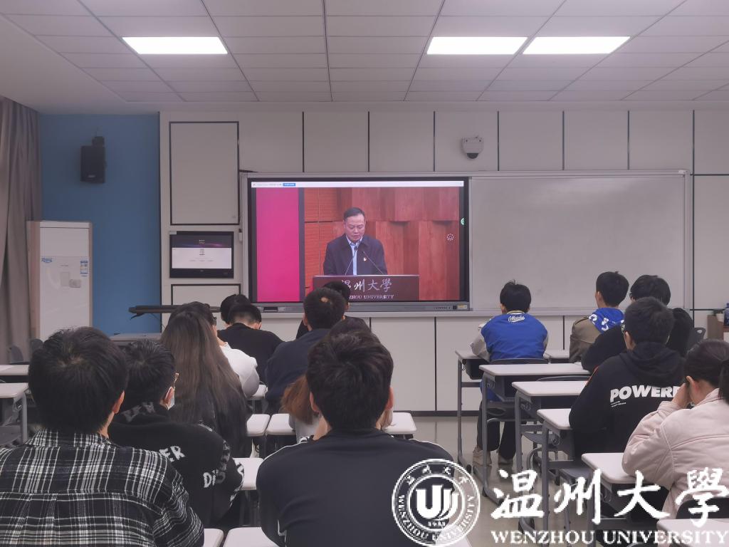2021年11月17日下午,电子竞技博彩 组织观看了“‘永远跟党走’温州市党史学习教育主题报告会(温州大学专场)暨党的十九届六中全会精神宣讲会”。电子竞技博彩 全体学生党员,入党积极分子参加并学习。