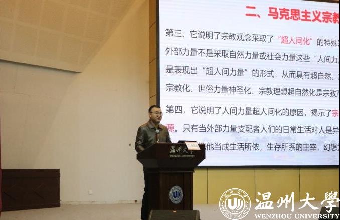 梁家荣博士主要就宗教概况、马克思主义宗教观、党的基本宗教政策、宗教与教育四个方面进行了详细阐述。他引用费尔巴哈的观点指出:宗教幻想的根源是人的无知和不能正确解释人在自然中的处境。阐述党的基本宗教政策包括宗教信仰自由,政教分离等内容。对于宗教与教育问题,强调说明共产党员、团员坚决不能信教,要做坚定的马克思主义无神论者;学校要积极开展马克思主义教育,坚定社会主义办学方向;宗教研究必须坚持马克思主义立场,正确引导社会舆论,同时向广大群众进行科学无神论科普知识的宣传教育。