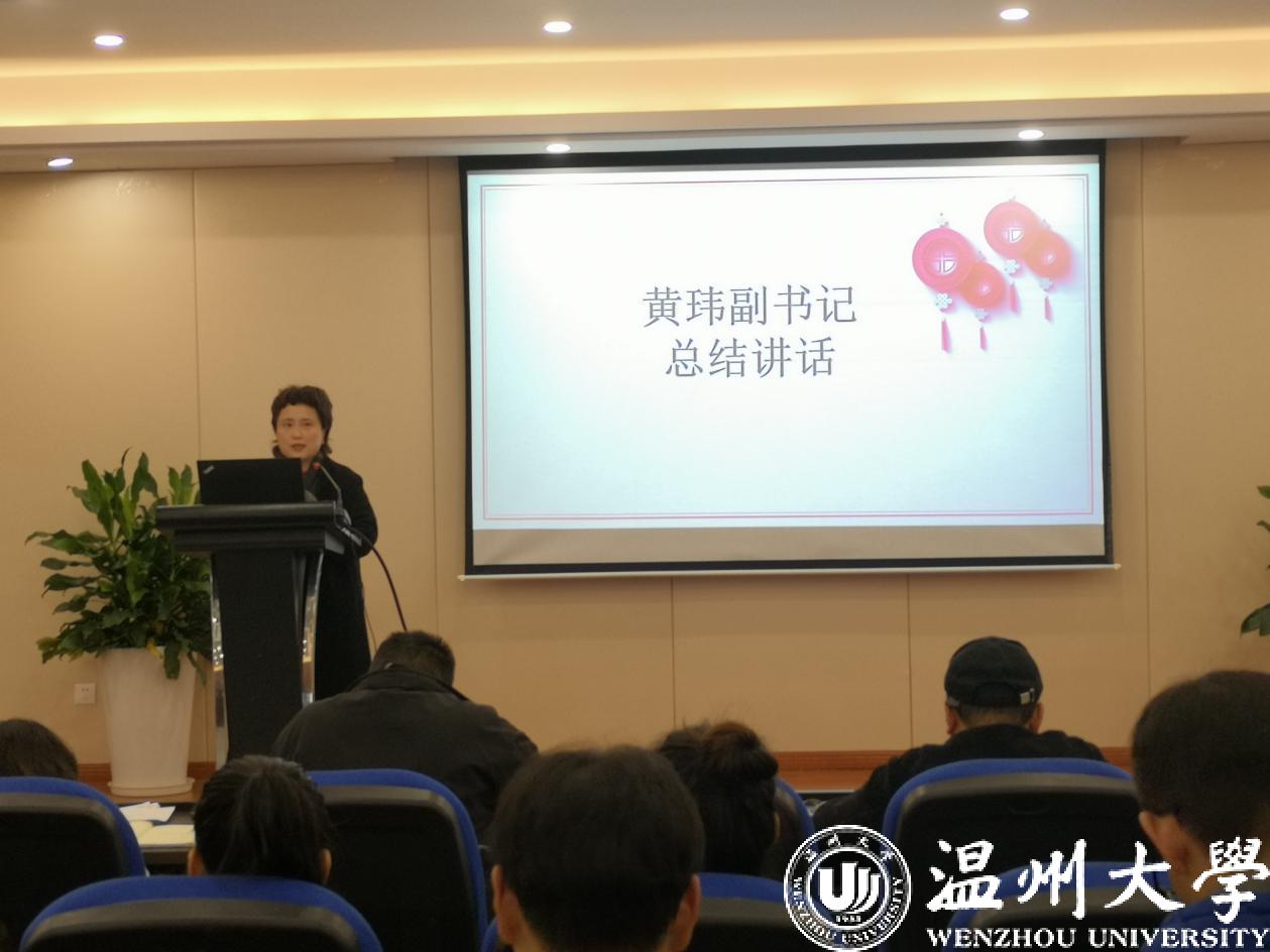 最后,电子竞技博彩 党委副书记黄玮总结讲话。她首先对各支部书记的认真履职并且取得的成绩表示了肯定;同时对抓实基层治理、优化顶层设计、强化理论学习、把控组织结构、提高党员凝聚力等方面提出了要求。希望大家聚焦理论学习,发挥党支部战斗堡垒作用;领学劝学,提升支部党员整体能力素质;每月一学,每周一聚,打造团队型党支部,真真切切地办实事、解难题,发挥党员先锋模范作用。