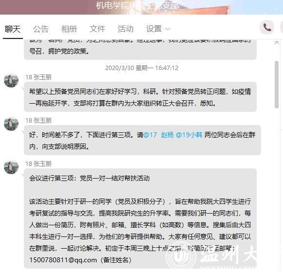 近日,十大电竞博彩排名 研究生党支部开展了“考研结伴行,大疫人有情”为主题的党员一对一帮扶活动,主要对参加考研同学进行与答疑与经验分享,研究生党支部党员及积极分子等20多名同志,踊跃投入到此次一对一帮扶活动当中。