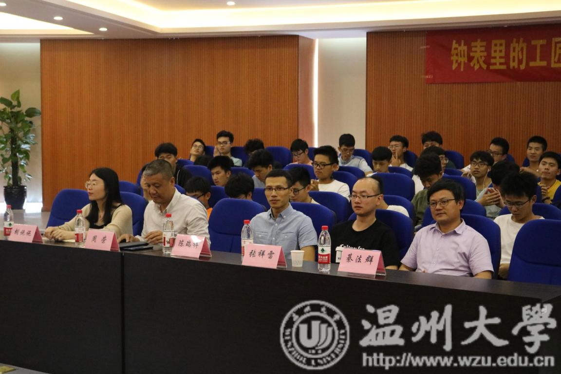 活动伊始,周荣书记为本次讲座致辞,热烈欢迎陈瑞祥先生的到来,还为陈先生颁发温州大学学生就业创业导师聘书。接着,陈先生用视频导入今天的专题讲座。视频中的一位双鬓斑白的手表修复匠人在缓缓讲述钟表的传承和修复技术,在他的身上完美诠释了工匠精神的内涵:精益求精,严谨,一丝不苟,耐心,专注,坚持,专业与敬业。随后,陈瑞祥先生凭借渊博的知识又将我们投掷于世界钟表文化的洪流之中。从日内瓦七艺,到瑞士钟表发展史,千年的历史跨越在陈瑞祥先生的侃侃而谈之中深入浅出地帮我们了解到了钟表文化的前身。除此之外,陈瑞祥先生还为我们普及了罗杰杜比品牌的发展史,讲述了该品牌是如何在传统制作工艺和前卫设计之间实现完美平衡的,十二圆桌骑士腕表惊艳四座正是二者之间完美平衡的结果。陈瑞祥先生渊博多才且风趣幽默,会议现场笑声连连。时不时提问在座的同学几个小问题,极大活跃了讲座现场的氛围。