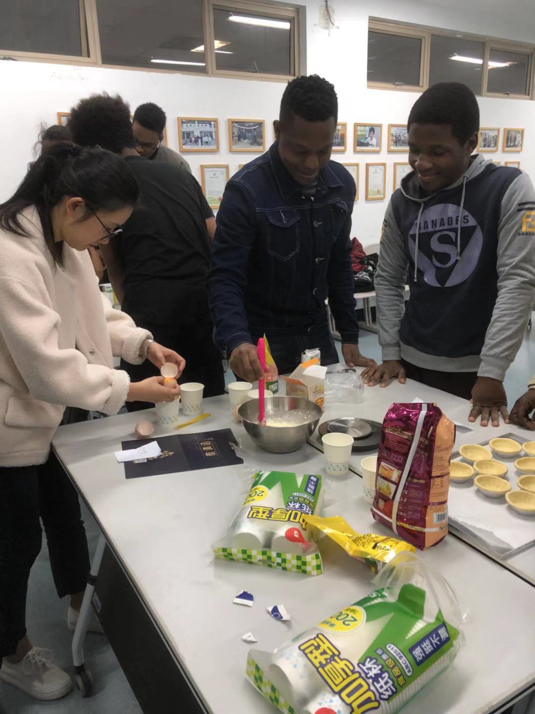 首先开始蛋挞的制作,在事先准备好的英文版菜谱及指导老师的指导下,留学生们手中的蛋挞很快就制作出来了。随后,大家开始挑战纸杯蛋糕的制作,虽然制作过程比较复杂,留学生们还是耐心地完成了蛋糕制作。闻着香喷喷的蛋挞和小蛋糕,留学生们欢呼雀跃,为自己的劳动成果感到喜悦。国际化教学部主任任燕老师和部分中国学生也饶有兴致地参与了此次活动。