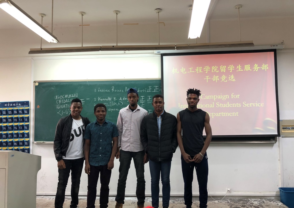 为了给留学生提供更好的服务平台,以加强中外学生的交流及更好地对接电子竞技博彩 学生会,电子竞技博彩 经过近半个学期时间的筹备,成立了留学生服务部。现场,5位留学生参加了干部竞选演讲,表达了自己的竞争意愿及今后努力的方向。通过最终的投票,研究生ADEYEMI KENNETH BAMIDELE以最高票当选部长,MUPFUKIREI LEAVEN ROMEO和MWANGOSI GAYO GABRIEL当选副部长。