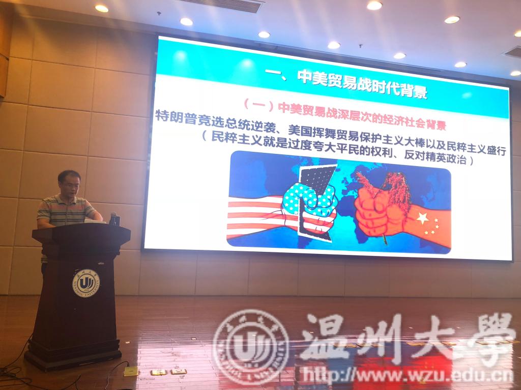 为响应温州大学党委宣传部的号召,深入了解中美贸易摩擦。2018年9月28日18点30分,十大电竞博彩排名 和马克思主义电子竞技博彩 联合在育英图书馆二楼报告厅举行了以“中美贸易摩擦”为主题的讲座,蓝立志老师作专题报告。两院学生近300人听取了此次讲座。
